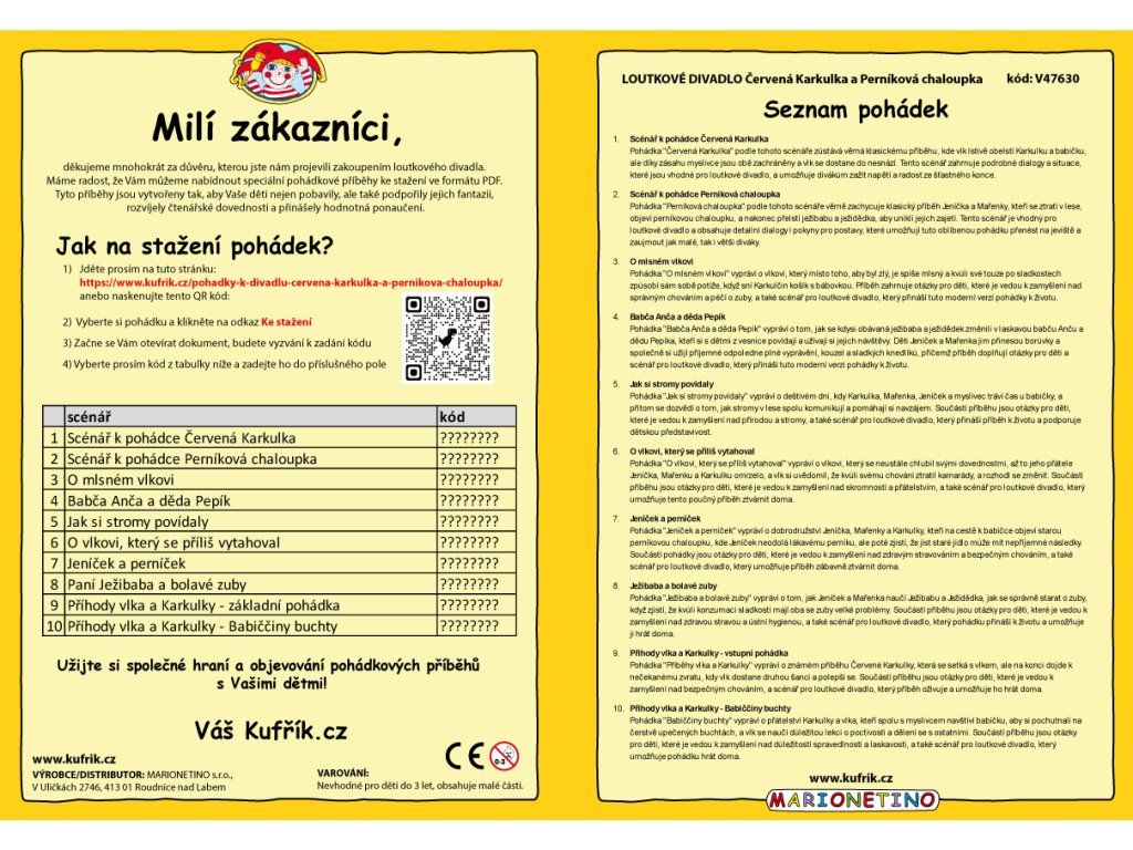 V balení nájdete tlačený zoznam rozprávok s kódmi. Po zadaní kódu na špeciálnej stránke si rozprávku stiahnete vo formáte PDF – pripravenú priamo na hranie s bábkami.