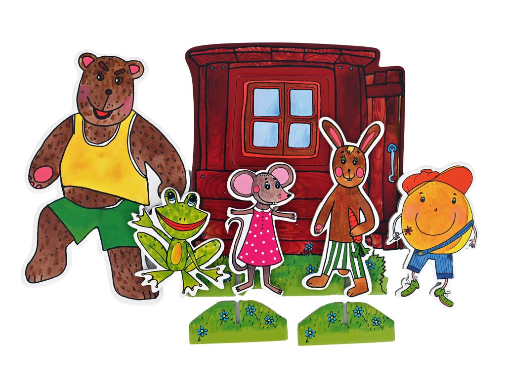 V balení nájdete päť roztomilých bábok a jednu kulisu domčeka. Deti sa s bábkami hrajú, rozprávajú a vymýšľajú vlastné príbehy, rodičia môžu rozprávku vyrozprávať alebo spoločne dotvárať dej. Bábky sú obojstranné, predná aj zadná strana je výtvarne spracovaná s dôrazom na detail.