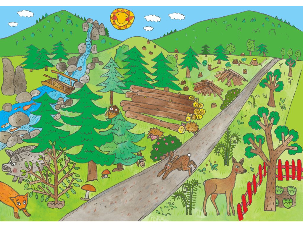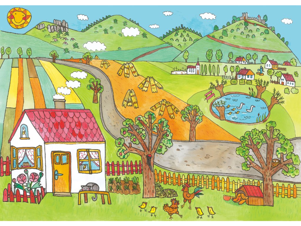 Zadná scéna k rozprávke O troch prasiatkach dopĺňa príbeh o jasne rozpoznateľné prostredie. Dva motívy na oboch stranách umožňujú meniť scénu podľa priebehu rozprávky.