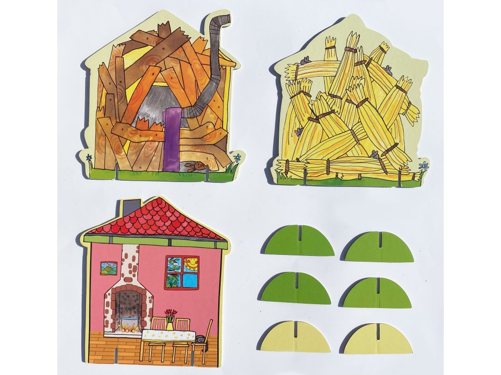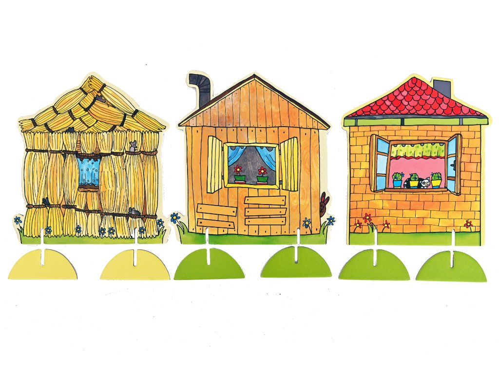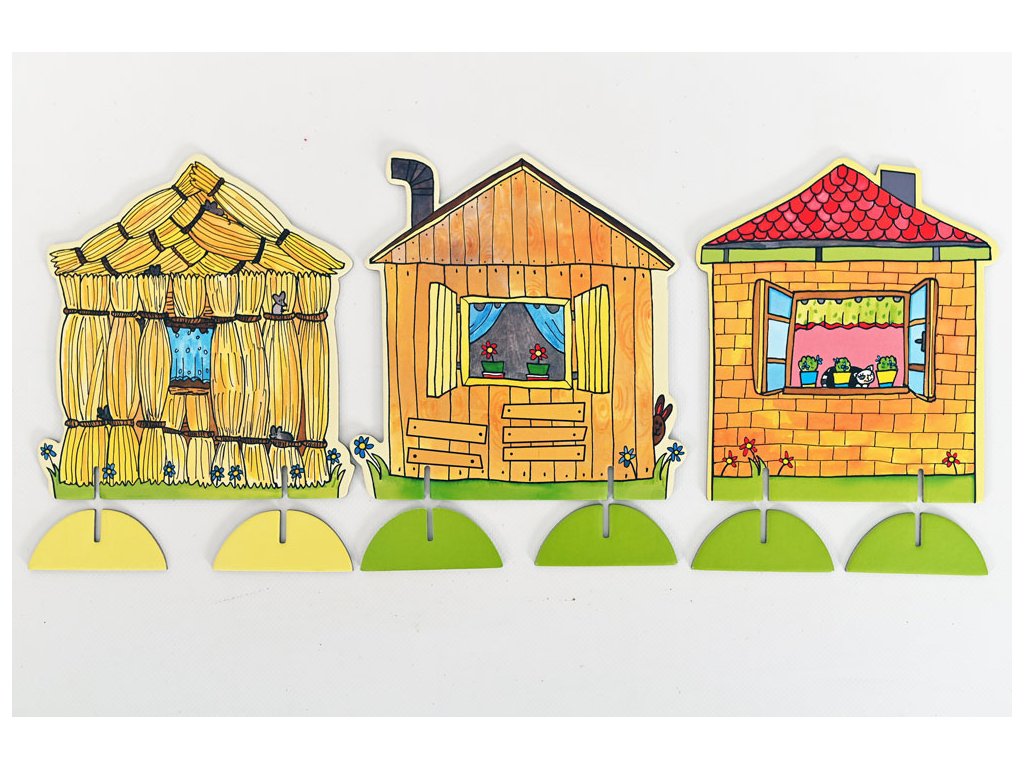 Súbor kulís k rozprávke O troch prasiatkach obsahuje tri domčeky – slamený, drevený a tehlový. Umožňuje zahrať celý príbeh so zreteľným vývojom deja.